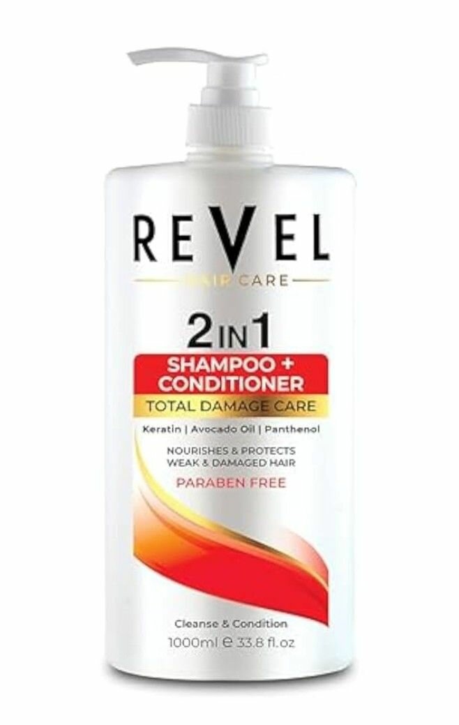 Découvrez Revel 2 en 1 Shampooing + Après-shampoing pour des cheveux renforcés et protégés. Enrichi en kératine, huile d'avocat et panthénol, il répare les cheveux abîmés. Soin sans parabènes, idéal pour la revitalisation quotidienne. Format pratique de 1000ml!