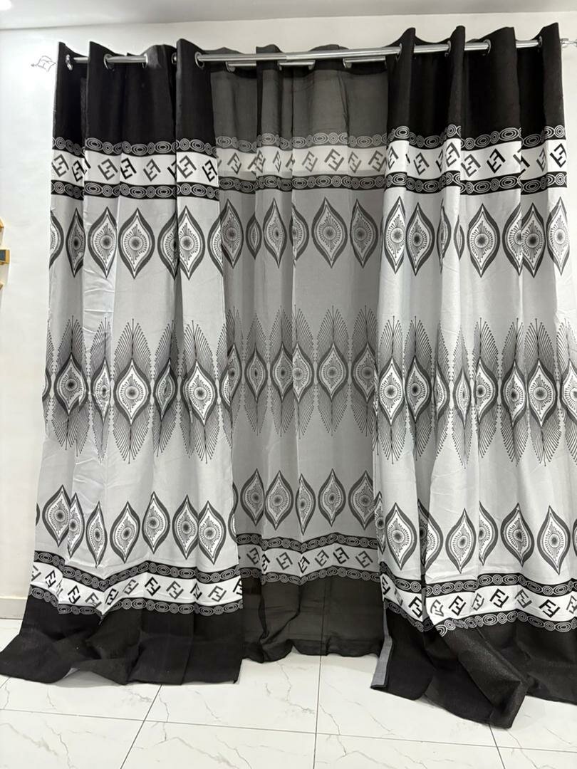Rideaux modernes avec motif géométrique noir et blanc. Parfaits pour décorer votre salon ou chambre. Tissu léger et élégant.