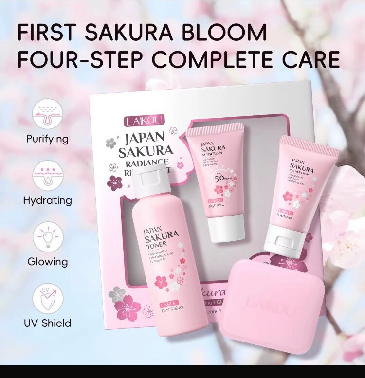 Découvrez le rituel de soin complet Sakura en quatre étapes : purification, hydratation, éclat et protection UV. Parfait pour une peau radieuse et saine.