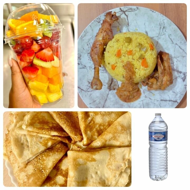 Profitez d'un repas complet avec des crêpes savoureuses, du poulet avec riz au légumes, une bouteille d'eau pure et une coupe de fruits frais. Idéal pour un déjeuner rapide ou un délicieux dîner. Parfait pour ceux qui recherchent un repas équilibré et pratique.