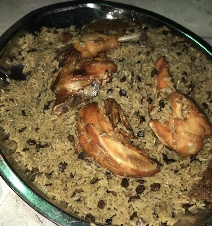Une porti9n de riz accompagné de 1/4 de poulet pondeuse