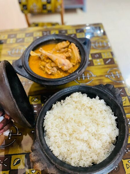 Portion généreuse de riz blanc, servie avec sa sauce maison et 1/4 de poulet. Repas idéal pour un déjeuner sain, parfumé et rassasiant, fait à la demande.