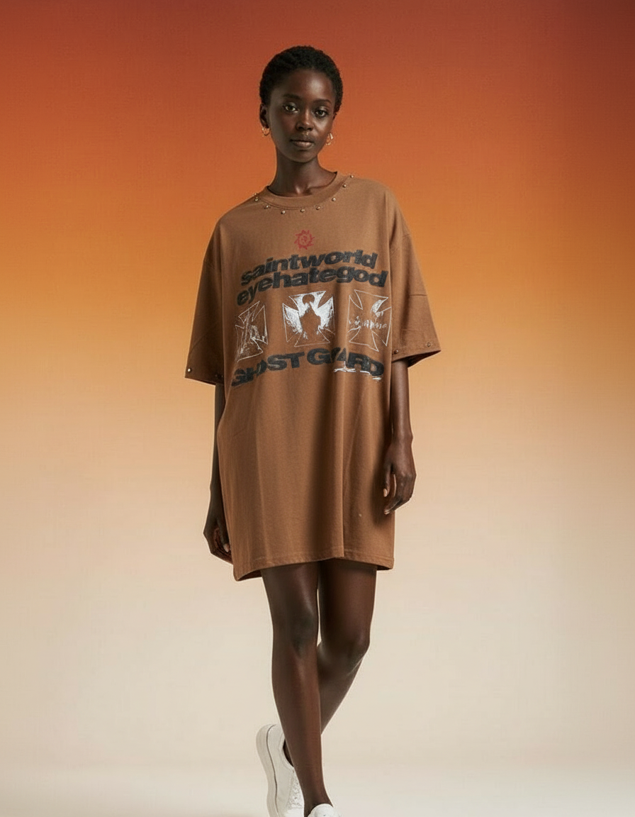 Découvrez cette robe ample marron avec un design graphique audacieux et un col agrémenté de clous. Parfaite pour un look décontracté et stylé, elle est idéale pour porter au quotidien ou pour des occasions décontractées. Fabriquée dans un tissu confortable, cette robe est un incontournable de la garde-robe moderne.