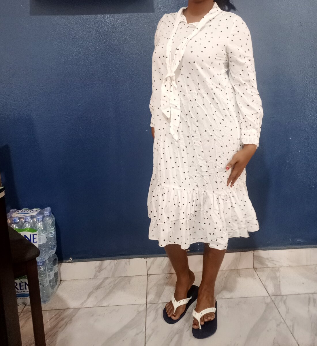 Élégante robe blanche à pois, parfaite pour un look chic et décontracté. Conception fluide avec manches longues et volant sur l'ourlet, idéale pour toutes les occasions. Parfaite pour un dîner ou une promenade estivale.