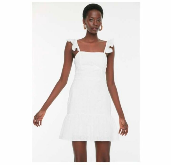 Cette robe blanche est idéale pour l'été avec ses bretelles à volants et sa coupe flatteuse. Parfaite pour les journées ensoleillées ou les soirées décontractées, elle allie confort et élégance. Son tissu léger assure une allure raffinée tout en restant confortable. Un choix parfait pour toute garde-robe estivale.