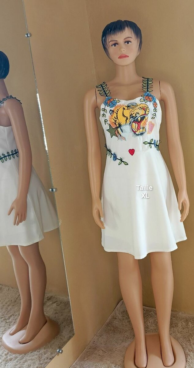 Découvrez cette élégante robe blanche évasée, parfaite pour toute occasion, avec des broderies uniques qui ajoutent une touche d'originalité. Taille XL, idéale pour un look chic et décontracté.