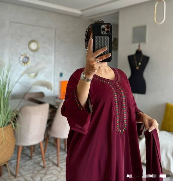 Robe bordeaux brodée, coupe ample, tissu fluide. Broderies détaillées pour une touche élégante. Idéale pour événements ou quotidien.