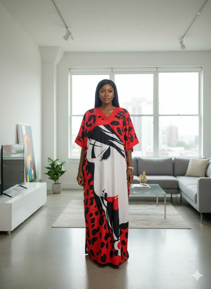 Découvrez cette élégante robe caftan avec un imprimé artistique unique. Parfaite pour une tenue décontractée et sophistiquée à la maison ou lors de sorties. Conçue pour offrir confort et style, elle est idéale pour toutes les occasions.