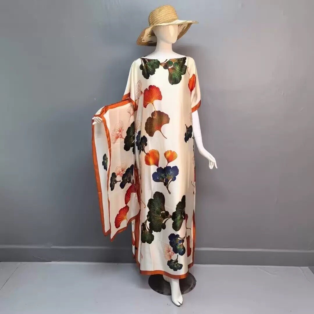 Élégant caftan en soie avec motifs vibrants. Idéal pour les soirées estivales ou décontractées. Confort et style en un seul vêtement.