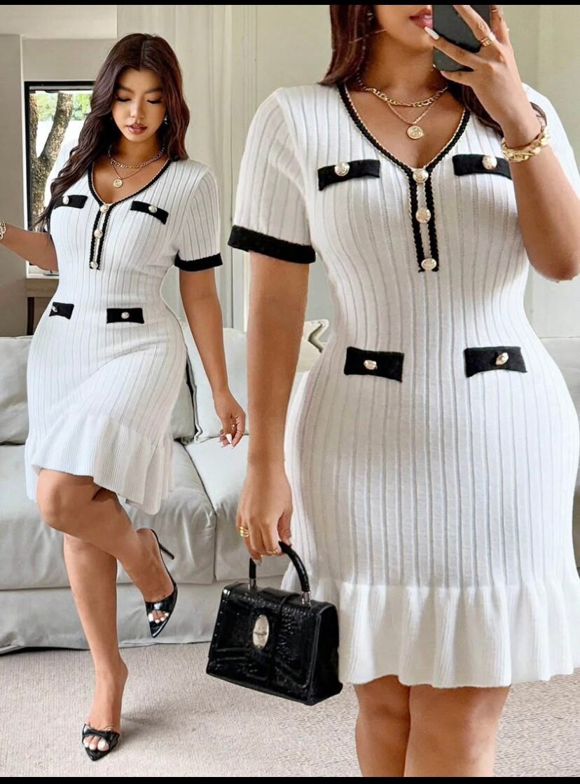 Élégante robe en tricot blanc à manches courtes, ornée de boutons décoratifs. Parfaite pour les occasions spéciales ou un look professionnel chic. Tissu confortable et extensible, convient à toutes les morphologies.