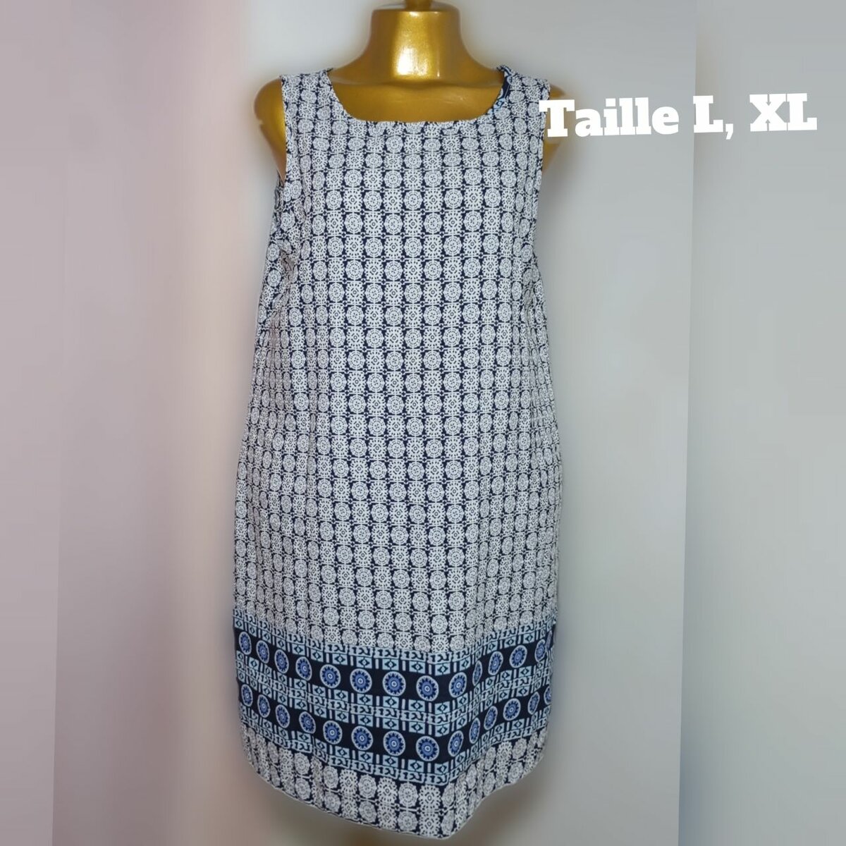Découvrez cette robe élégante sans manches, parfaite pour les occasions décontractées ou semi-formelles. Conçue dans un tissu confortable, elle présente un motif géométrique distinctif qui ajoute une touche de sophistication. Disponible en tailles L et XL.