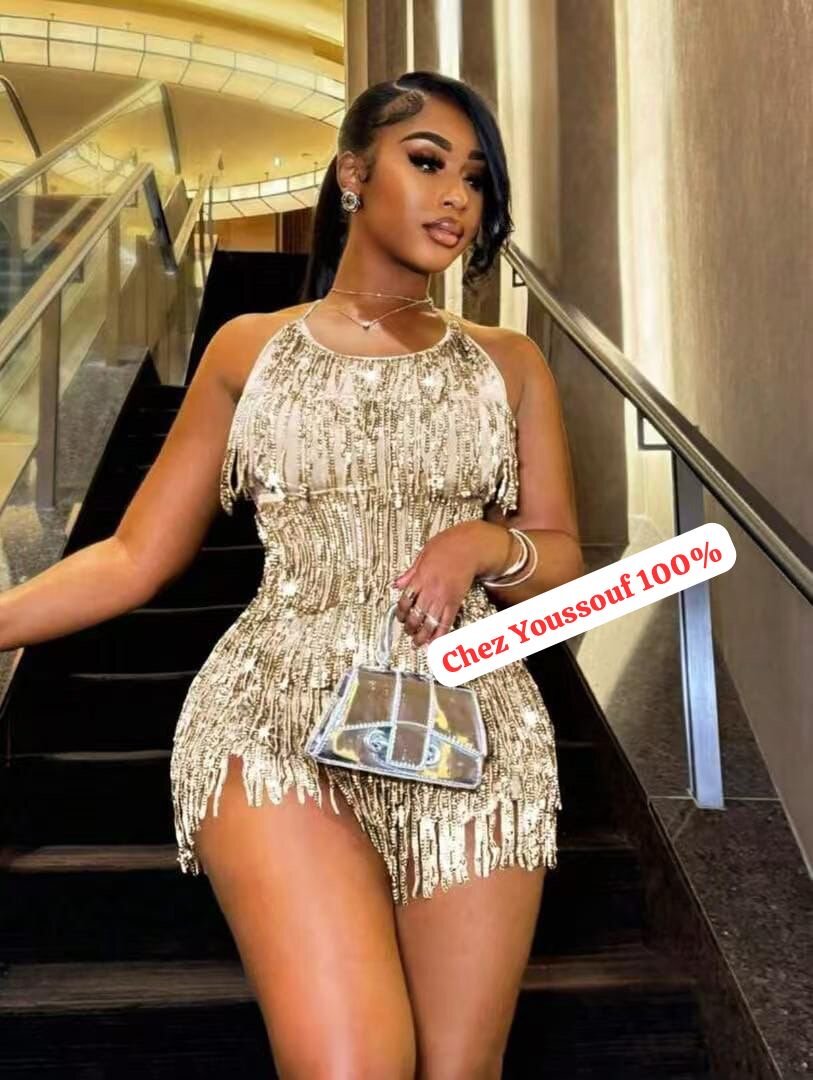 Découvrez cette robe courte élégante et branchée, parfaite pour les soirées. Conçue avec des paillettes métallisées et des franges, elle offre un look glamour et irrésistible. Disponible en différentes couleurs pour s'adapter à vos goûts.