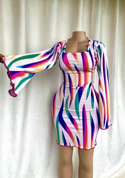 Robe près du corps, manches longues évasées, imprimé multicolore vif, parfaite pour les sorties ou une allure moderne et audacieuse.