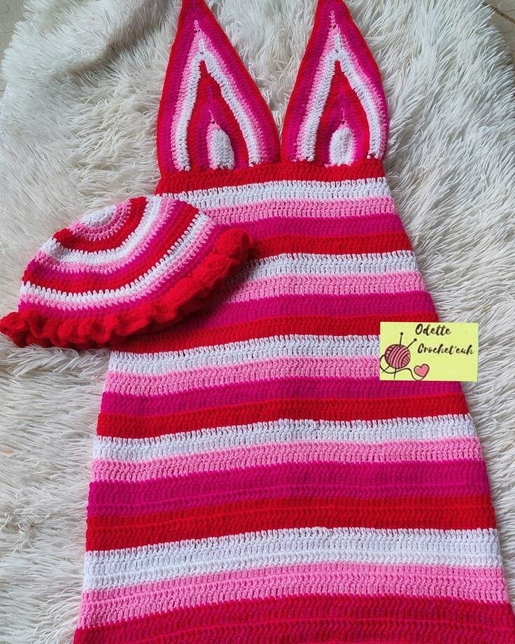 Magnifique robe crochetée à rayures roses et blanches avec bonnet assorti. Parfaite pour les occasions spéciales ou pour un look quotidien adorable et unique. Fabriquée à partir de matériaux doux et confortables.