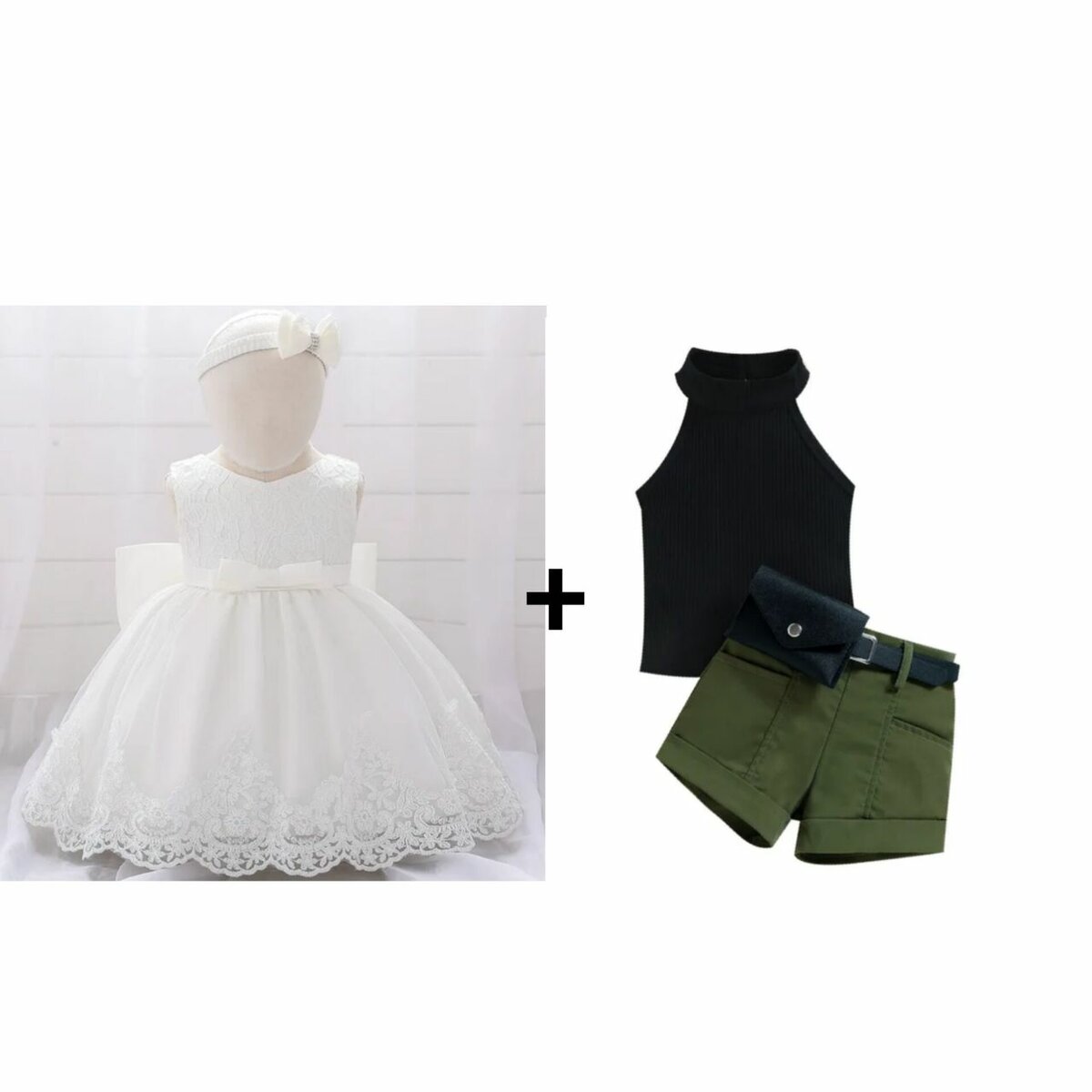 Parfait pour des occasions spéciales, cet ensemble contient une élégante robe de baptême pour fille avec dentelle et un ensemble débardeur et short pour garçon. Idéal pour des cérémonies ou des photos mémorables.