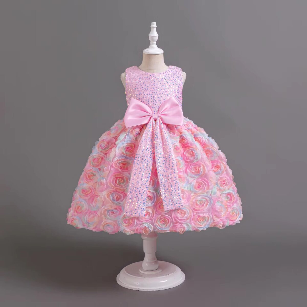 Élégante robe pour filles avec un design fleuri et un grand noeud, parfaite pour cérémonies et occasions spéciales. Disponible en rose et bleu.
