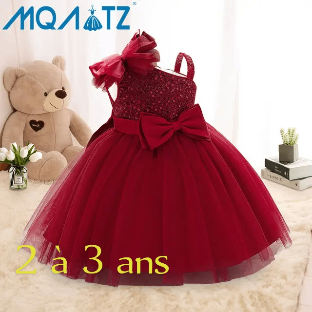 Élégante robe rouge pour fillettes de 2 à 3 ans. Parfaite pour les occasions spéciales, elle offre un design scintillant avec nœud décoratif.