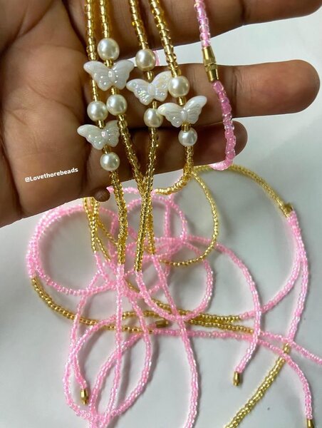 Collier en perles blanches et papillon rose