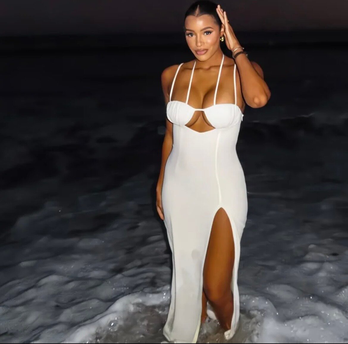 Découvrez l'élégance avec cette robe de soirée blanche à fines bretelles. Parfaite pour les occasions spéciales, sa coupe féminine flatte la silhouette. Fabriquée avec des matériaux de qualité, elle est idéale pour un look sophistiqué et glamour en bord de mer. Un choix parfait pour briller lors d'une soirée.