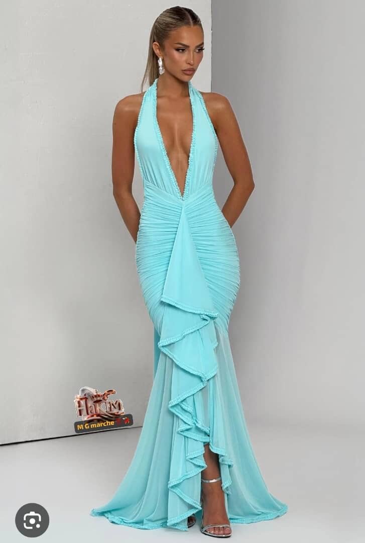 Cette robe de soirée bleu clair présente une coupe sirène flatteuse et un col plongeant, parfaite pour les soirées.