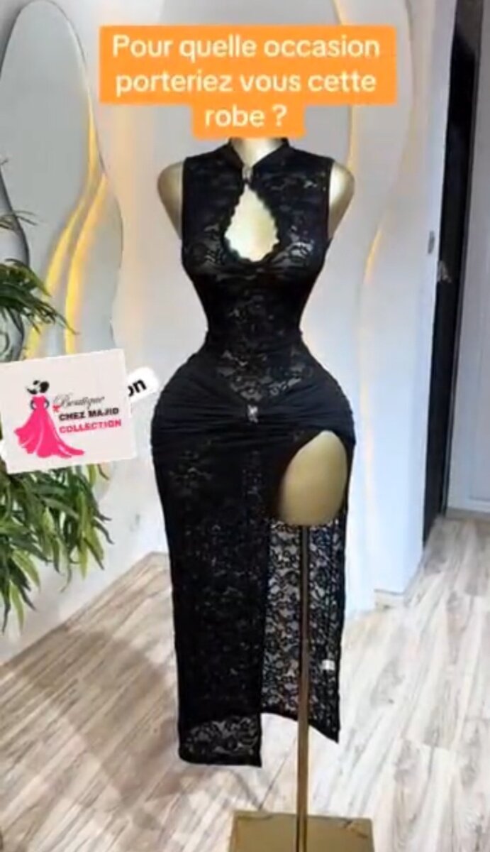 Optez pour l'élégance audacieuse avec cette robe de soirée en dentelle noire. Parfaite pour les événements formels ou les soirées spéciales, elle vous assure une allure chic et sophistiquée. Dotée d'une découpe séduisante et d'une fente haute, cette robe met en valeur votre silhouette avec raffinement. Idéale pour celles qui souhaitent se démarquer lors d'une occasion unique.