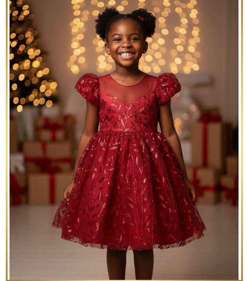 Charmante robe de soirée rouge pour enfant, parfaite pour les occasions spéciales. Design élégant avec manches bouffantes et détails pailletés. Idéale pour les fêtes et célébrations.