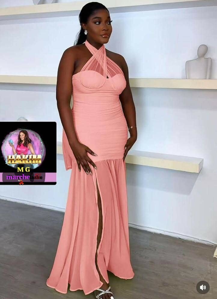 Sublimez votre allure avec cette robe de soirée longue couleur pêche. Conçue pour des occasions spéciales, elle offre un tombé fluide et élégant. Son décolleté travaillé apporte une touche glamour. Parfaite pour un gala ou une soirée mondaine, cette robe vous distinguera par son allure raffinée.