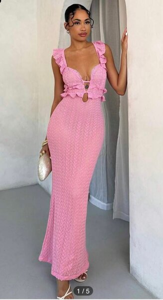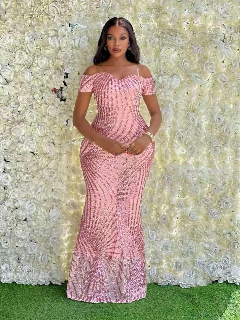 Élégante robe longue rose ornée de strass pour des occasions spéciales. Parfaite pour un mariage ou une soirée de gala.
