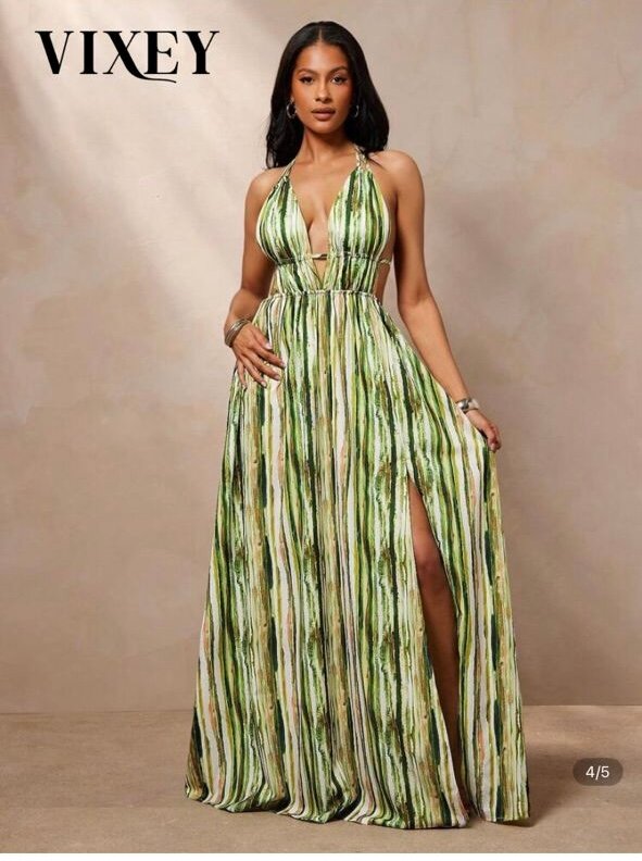 Élégante robe d'été avec un décolleté plongeant et une coupe flatteuse. Parfaite pour soirées ou événements. En tissu léger et confortable, elle offre un look sophistiqué et féminin. Disponible en plusieurs imprimés séduisants.