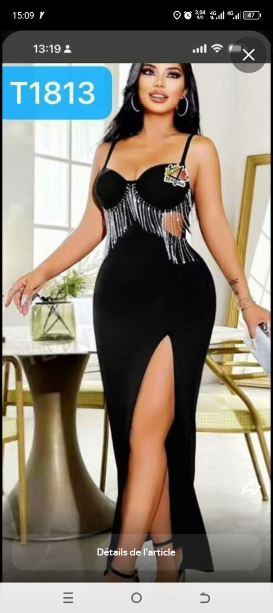 Cette robe noire avec fentes et franges scintillantes est idéale pour une soirée glamour. Conçue pour accentuer la silhouette, elle est parfaite pour des occasions spéciales ou des événements formels.