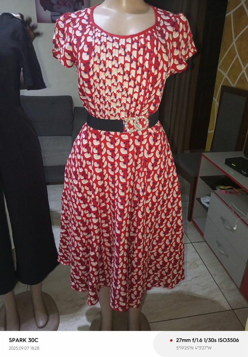 Découvrez cette robe charmante avec des motifs rouges captivants, idéale pour toutes les occasions spéciales. Sa ceinture noire accentue la taille pour une silhouette élégante. Confortable et stylée, elle est parfaite pour mettre en valeur votre féminité lors de vos sorties. Un choix incontournable pour un look chic et sophistiqué.