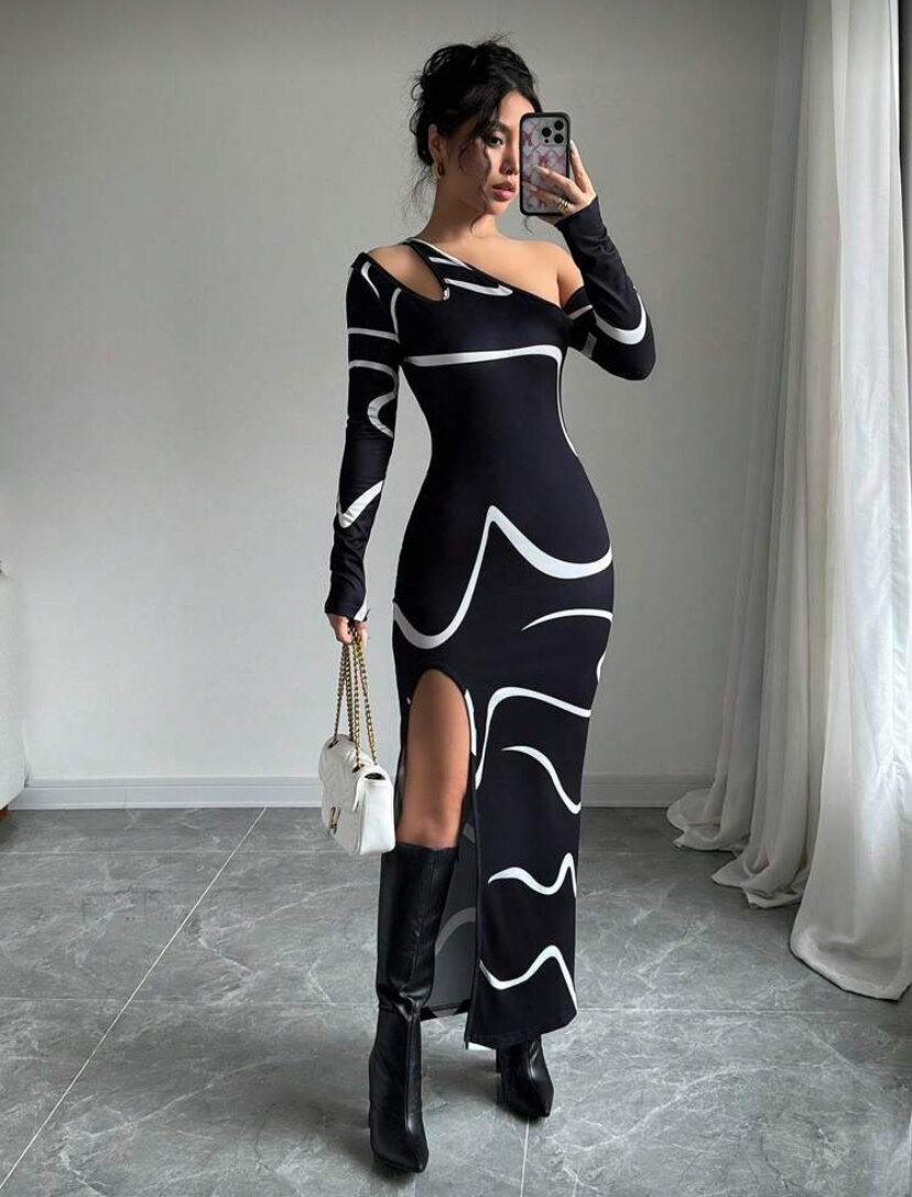 Découvrez cette robe longue élégante, idéale pour les soirées ou occasions spéciales. Avec son design asymétrique et ses motifs abstraits, elle garantit un look moderne et audacieux. Confectionnée avec soin, elle offre confort et style.