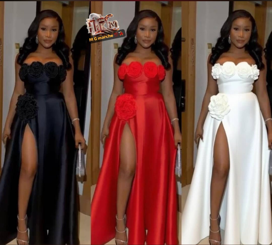 Séduisante robe soir en satin, ornée de fleurs et d'une fente audacieuse. Idéale pour soirées et occasions spéciales, offrant glamour et confort. Disponibles en noir, rouge et blanc.