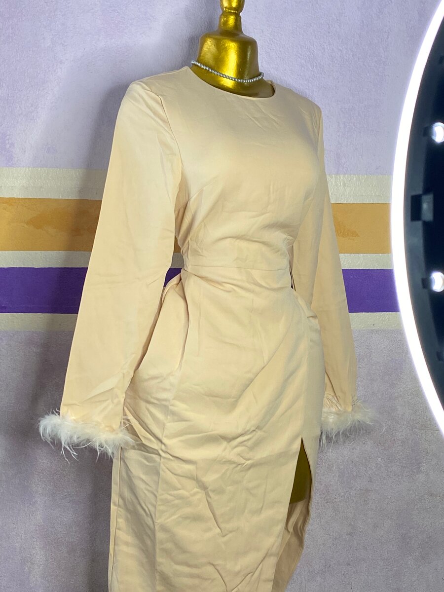 Cette robe chic à manches longues est parfaite pour toutes les occasions spéciales. Dotée de détails en plumes aux poignets, elle combine élégance et confort. Idéale pour être portée lors de soirées ou événements formels.