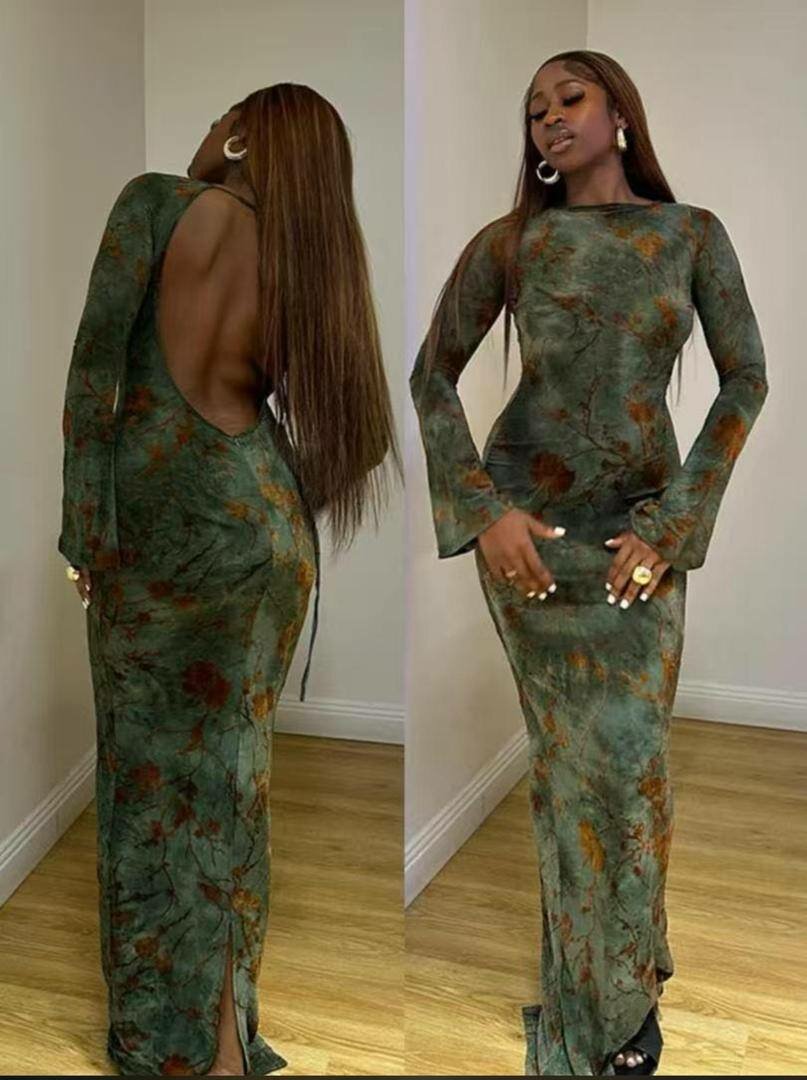 Élégante robe longue à manches, idéale pour les soirées et événements spéciaux. Son design dos nu crée un look séduisant et glamour, parfait pour se démarquer.