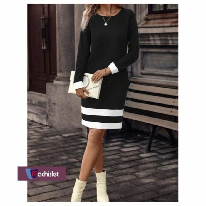 Cette robe chic arbore un design noir distinctif avec des bandes blanches contrastées, idéale pour une sortie en soirée ou une réunion professionnelle. Fabriquée avec soin, elle allie confort et style. Portez-la avec des accessoires minimalistes pour un look sophistiqué.