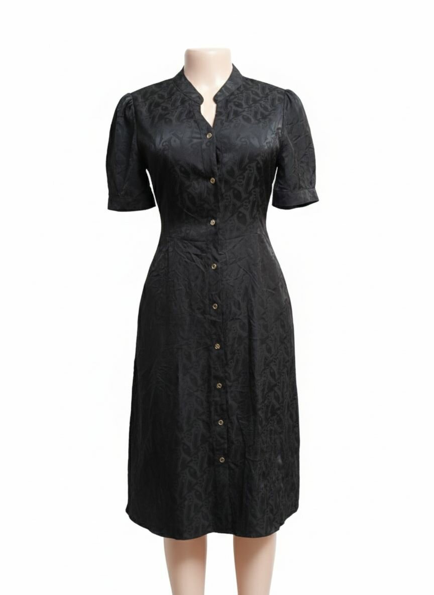 Robe noire élégante avec boutons dorés, parfaite pour une soirée ou un événement spécial. Conception en tissu texturé pour un look raffiné. Idéale pour ajouter une touche de sophistication à votre garde-robe.