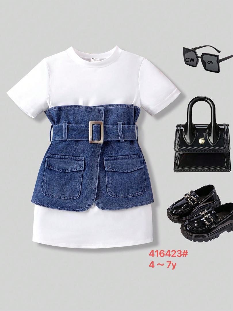 Cette robe tendance combine coton doux et denim robuste, avec une ceinture élégante. Idéale pour des occasions décontractées ou formelles. Convient aux filles de 4 à 7 ans. Complétez le look avec des accessoires et des chaussures chic!