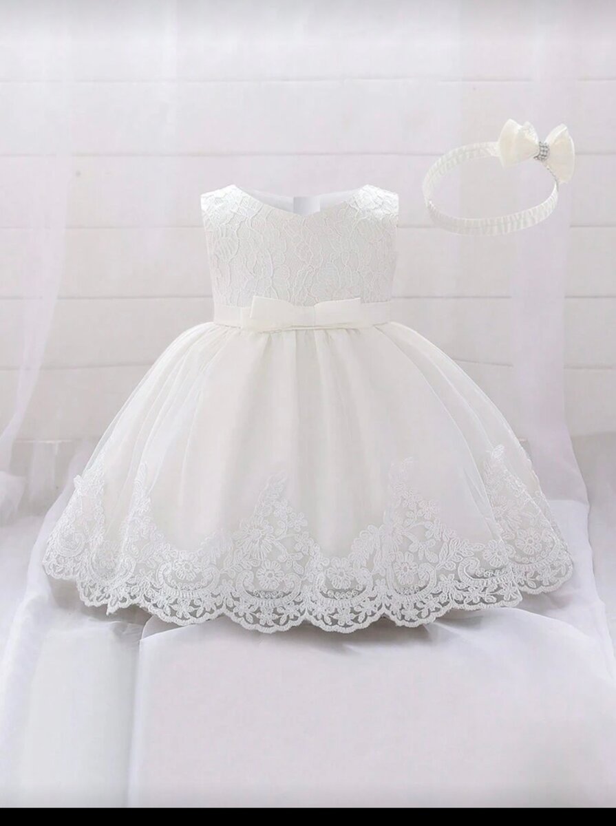 Belle robe blanche en dentelle pour filles, design élégant avec un noeud et bandeau assorti. Parfaite pour cérémonies ou occasions spéciales.
