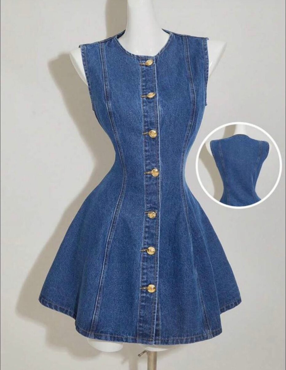 Robe en jean sans manches avec boutons dorés, parfaite pour un look décontracté et moderne. Idéale pour les sorties estivales ou une journée en ville. Fait en denim de haute qualité pour un confort et un style optimal.
