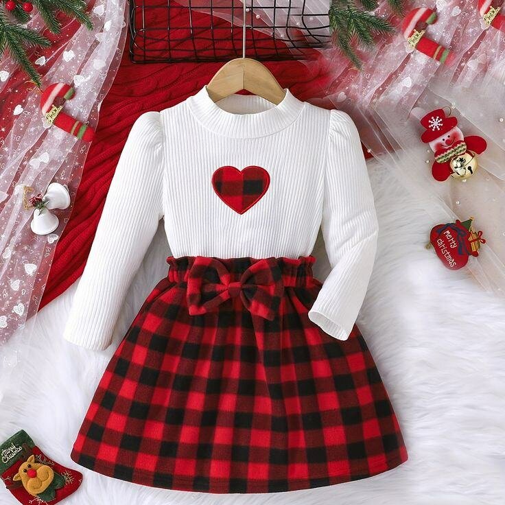 Éblouissante robe enfant avec motif cœur et carreaux, idéale pour les célébrations de Noël. Confortable et élégante, elle fera de votre petite fille la star des fêtes. Parfaite pour les photos de famille et les réunions festives!