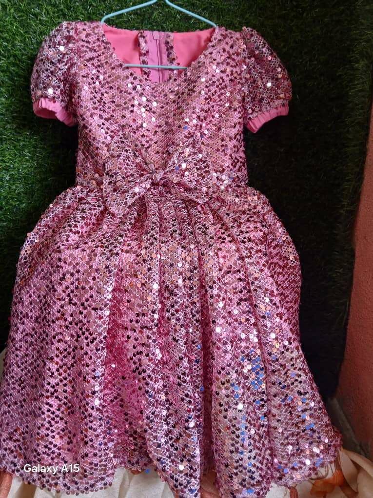 Élégante robe pour fille en tissu scintillant rose, idéale pour les occasions spéciales. Confectionnée avec des paillettes lumineuses, elle offrira à votre enfant un look enchanteur. Parfaite pour les fêtes, mariages ou anniversaires.
