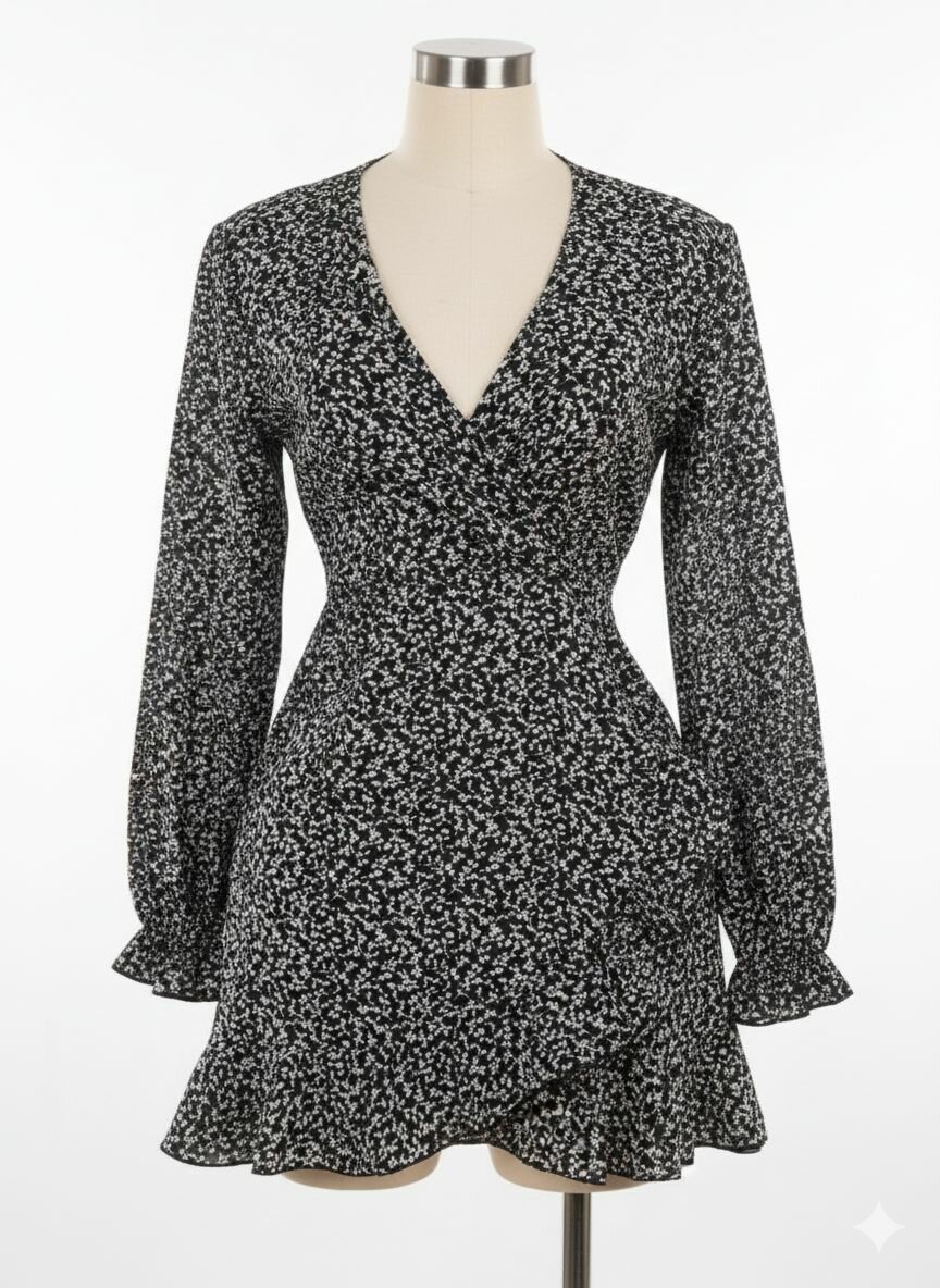 Cette robe enveloppnoire et blanche, ornée d'un motif floral délicat, est parfaite pour une soirée chic ou une journée au bureau. Avec ses manches longues et sa coupe flatteuse, elle assure confort et élégance. Idéale pour impressionner avec style et sophistication.