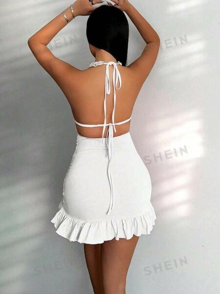 Robe courte évasée pour femme, idéale pour soirées ou cocktails. Disponible en noir et blanc, avec un design sans manches et détails volantés. Matière confortable et élégante pour un look chic.