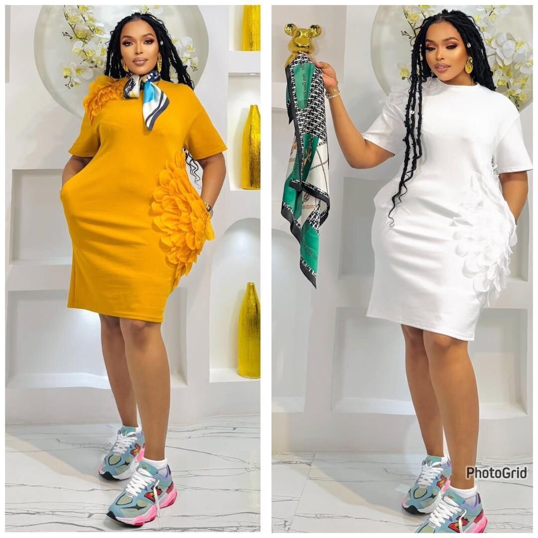 Découvrez cette robe femme élégante avec des détails floraux en relief. Disponible en blanc et jaune, elle est idéale pour les occasions décontractées et chic. Sa coupe confortable et ses poches pratiques en font un choix parfait pour une journée stylée. Agrémentez-la d'une écharpe pour un look complet.