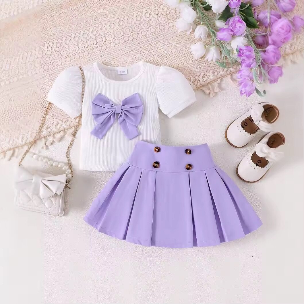 Adorable complet enfants en tissu blanc et lilas, ornée d'un joli noeud lavande. Conçue pour les 6-9 mois, elle offre confort et style. Idéale pour les occasions spéciales ou les sorties quotidiennes. Associez-la avec des accessoires assortis pour un look parfait. Cadeau idéal pour une petite princesse.