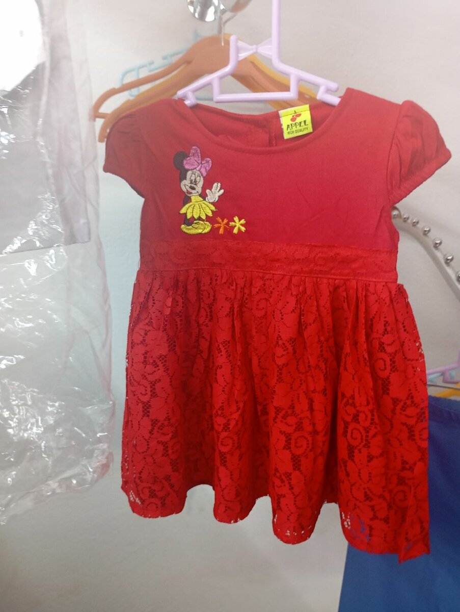 Adorable robe rouge en dentelle pour fille, ornée d'un motif Minnie Mouse. Idéale pour les occasions spéciales, cette robe allie confort et style pour sublimer votre enfant. Matière douce pour un port agréable.