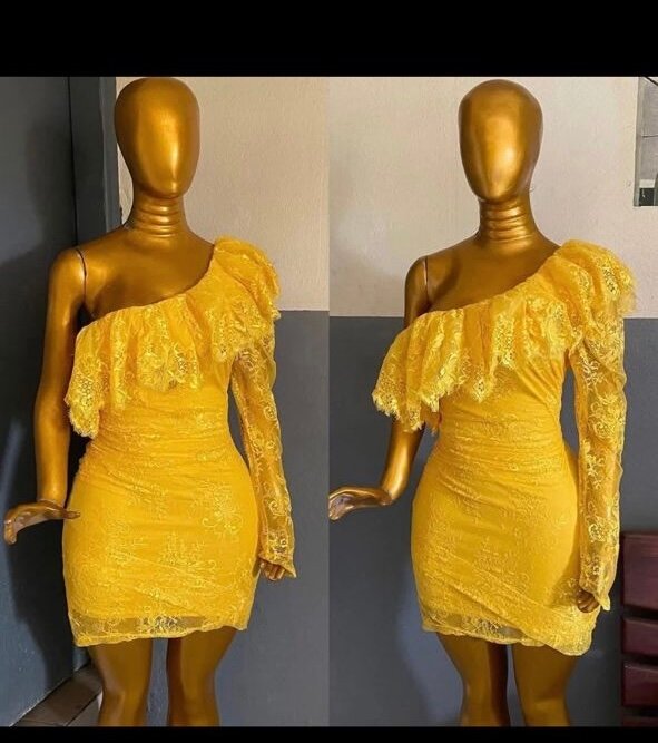 Éblouissante robe jaune en dentelle avec un élégant design asymétrique à une manche. Parfaite pour les événements spéciaux, elle garantit une apparence inoubliable. La coupe ajustée accentue votre silhouette, tandis que le volant ajoute une touche de féminité. Idéale pour les soirées ou les cocktails.
