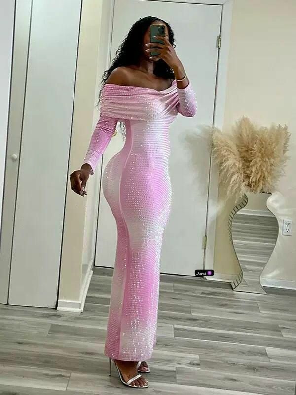 Éblouissante robe longue à paillettes rose, parfaite pour événements spéciaux et soirées glamour. Tissu extensible et confortable, design épaules dégagées pour un look élégant. Attirez tous les regards et brillez toute la nuit! Idéale pour occasions spéciales ou tenues de soirée.