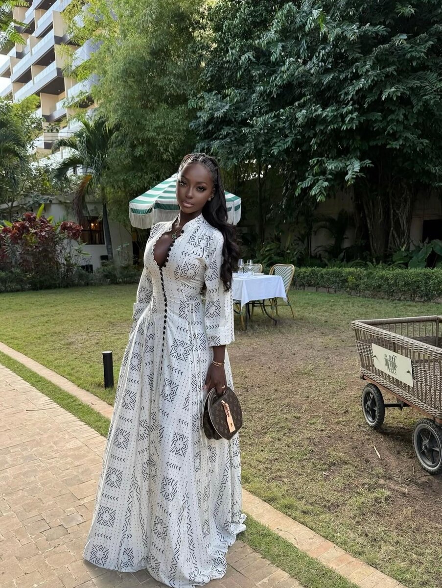 Élégante robe longue blanche avec motifs géométriques pour femmes. Parfaite pour les occasions spéciales ou une soirée chic en plein air.